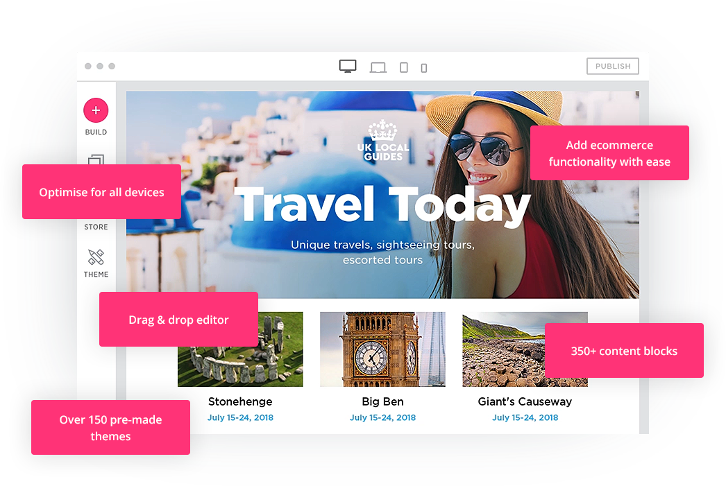 Create a modern website in minutes - no tech skills required. Just choose a design you like, add your content and publish. Plus, you get a domain and hosting included with purchase.